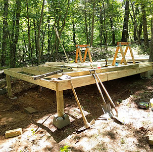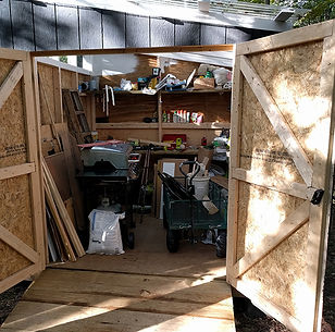 Our shed has been a fun building experiment with a small dip into living off grid. It was conceived to serve a dual purpose: storage and . "convenience". First, we needed a place to leave tools and supplies and random stuff]. But - vacant for a decade - the property had served as a sort of local community park. So, we looked to walls, a roof and some locks to give us peace of mind. Second, from the beginning we knew we wanted to camp with a certain level of comfort. This required some sort of bathroom facility. County regulations did not allow for a pit outhouse so we decided to look into composting toilets. Initially we looked at a self-contained toilet but found that they seemed cumbersome and not very visually appealing... Not the experience we wanted. A composting toilet with a separate composting chamber that goes below the floor was a bit more expensive but allowed the toilet to look like what you expect a toilet to look like. Some of our friends were having a little trouble getting comfortable with the idea of using a composting toilet, thus if we wanted them to visit and be at peace when doing their business this was going to be the better option. The change in direction required the structure around the toilet to have space below, but the building still needed to work as a storage shed that things could be wheeled in and out of. Building on slope limited the build sites but would fit the need.